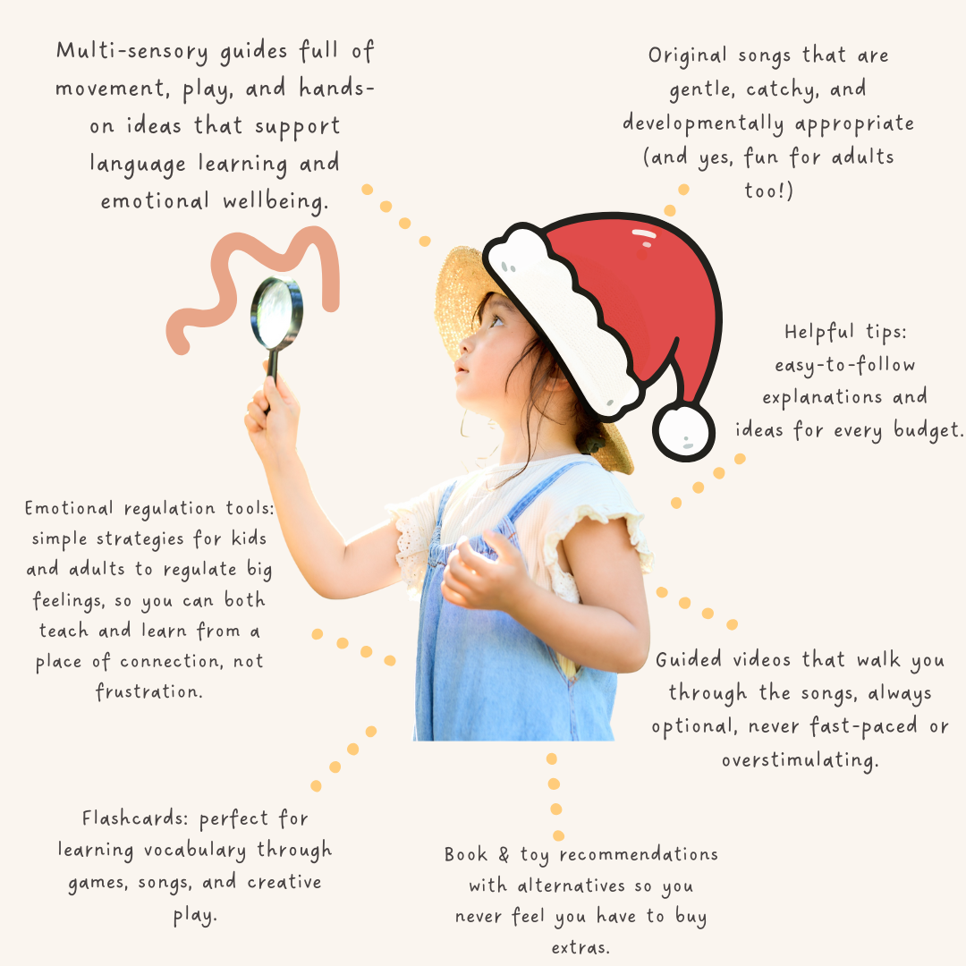 Because you and your child are one of a kind. This program was created by someone who knows what it’s like to have a million tabs open in your brain (hi, ADHD soul here 🙋🏻♀️). That’s why it’s made to be flexible, sensory-friendly, and easy to follow, even when your day feels a bit all over the place. When children are upset, their brains shift into survival mode, which makes it nearly impossible to focus or absorb new information. Yet emotional regulation is often the missing piece in learning, and I’m here to change that. I look at your child as a whole person: when one thing is out of balance, everything else is too. So we don’t just learn a new language, we create the right conditions for it to stick. You don’t have to be perfect, no one is. Just showing up with love and an open mind is more than enough, and there’s plenty of room for your own creativity!